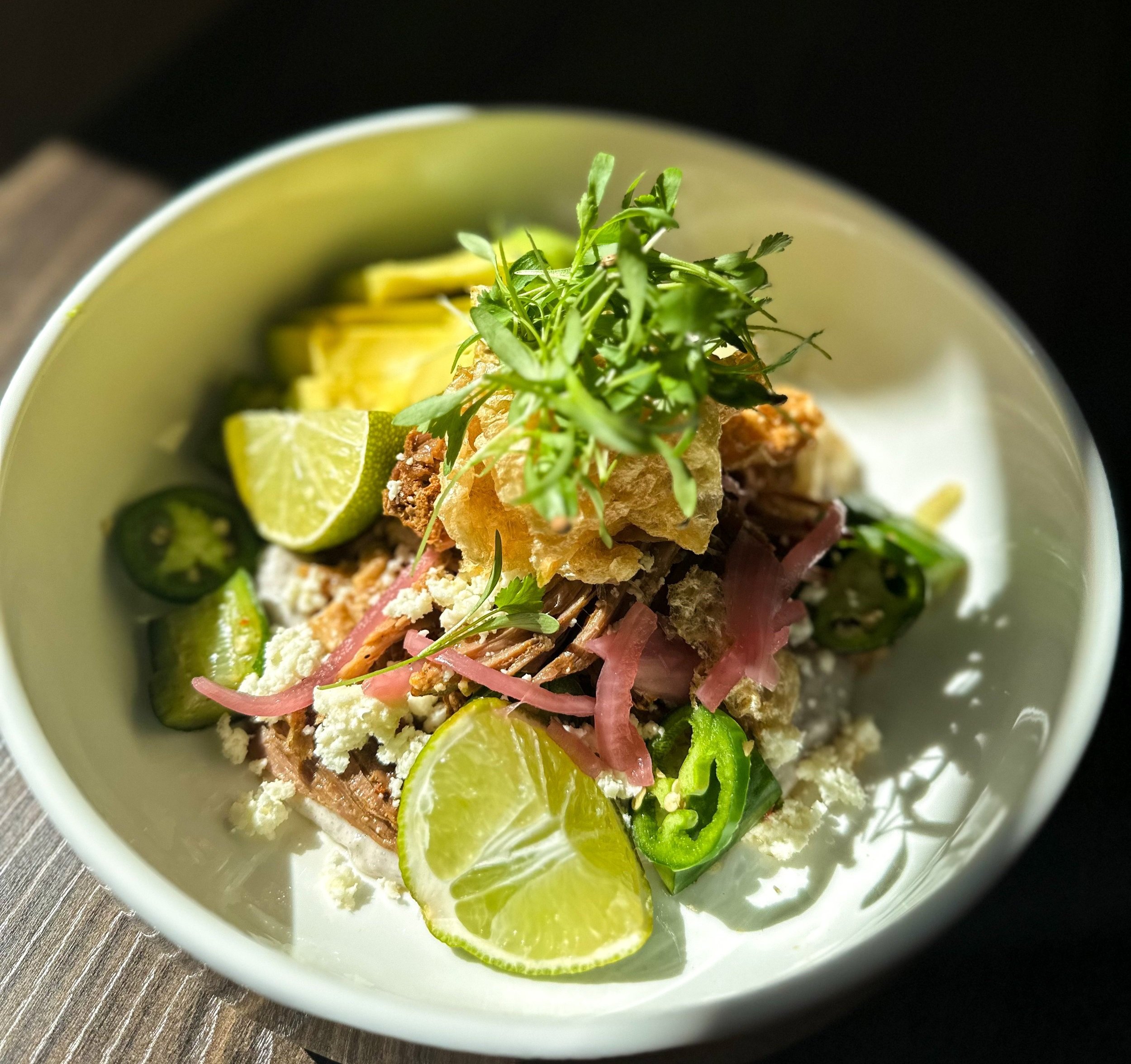 slow-roasted pork, saffron rice, salsa verde, queso fresco, pickled onion & cilantro